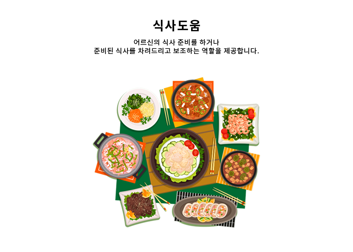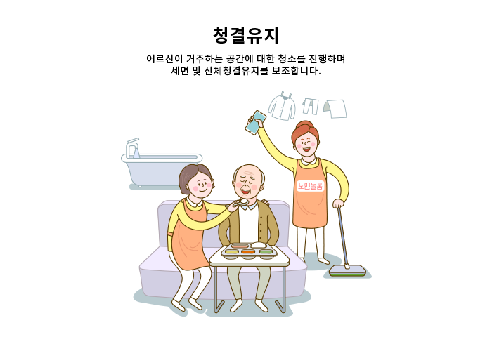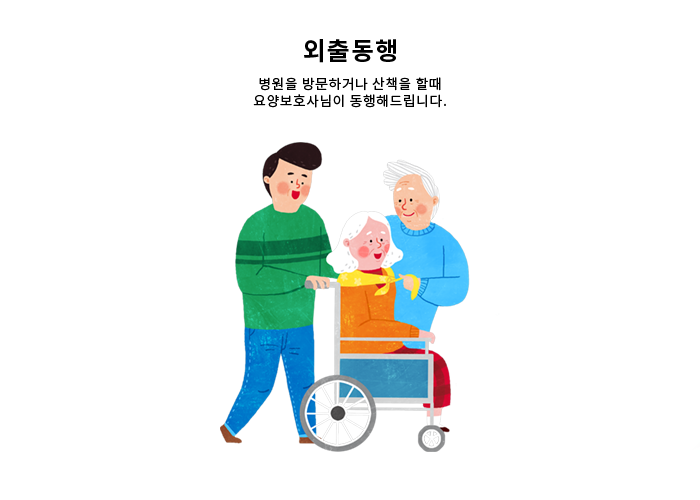 방문요양서비스란 노인장기요양등급을 받으신 어르신 댁에 국가공인 요양보호사가 방문하여 청소, 빨래, 식 사도움, 외출동행, 말벗 되어주기 등을 제공하는 서비스입니다